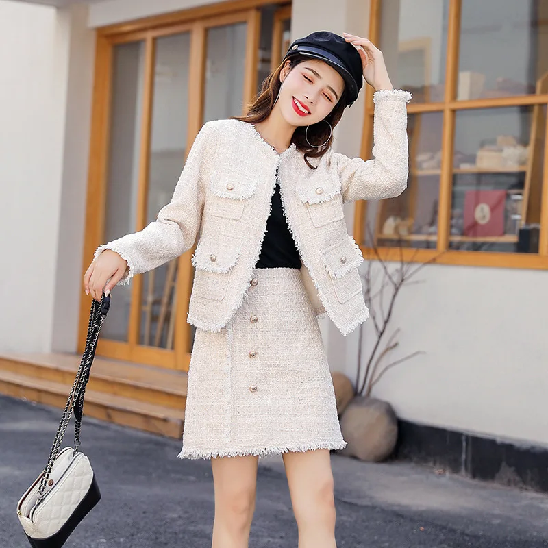 Beste prijs - Set vrouwen korte jasje half-lengte A-lijn rok 2 sets van vrouwen herfst mode temperament tweed professionele twee stuk pak